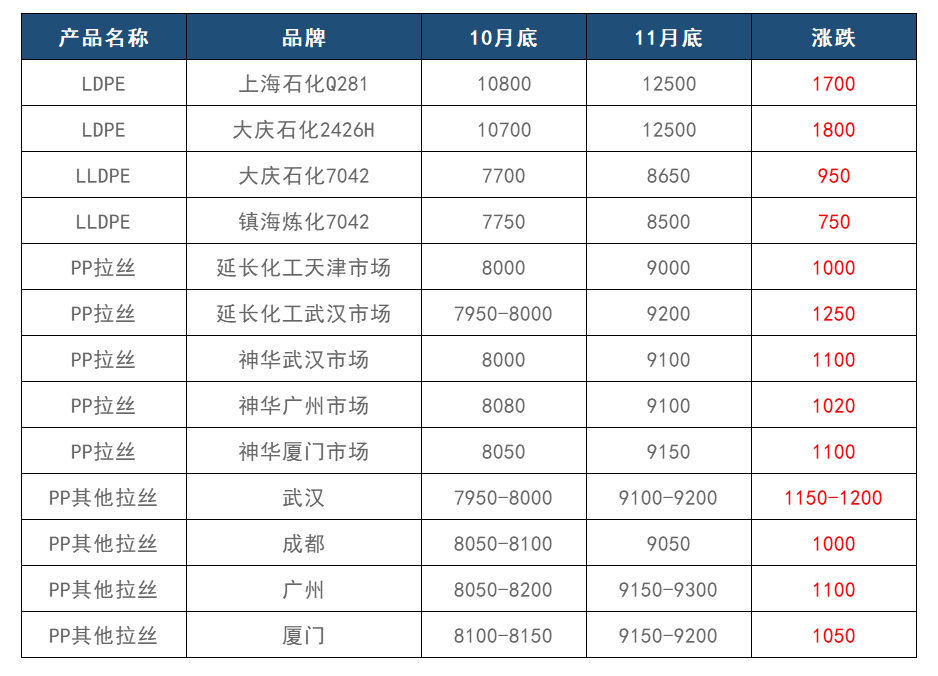 11月(yue)中,聚(ju)乙烯(xi)市場(chang)也開(kai)始了(le)一場(chang)反擊(ji)表演(yan),其中(zhong)高壓(ya)👯🏾♂️價格(ge)再刷(shua)新高(gao),價格(ge)主流(liu)價格(ge)在12500-12900元(yuan)/噸,較(jiao)月初(chu)上漲(zhang)1750-1950元/噸(dun),線性(xing)主流(liu)報價(jia)8500-8800元/噸(dun),較月(yue)初上(shang)漲300-800元(yuan)/噸。